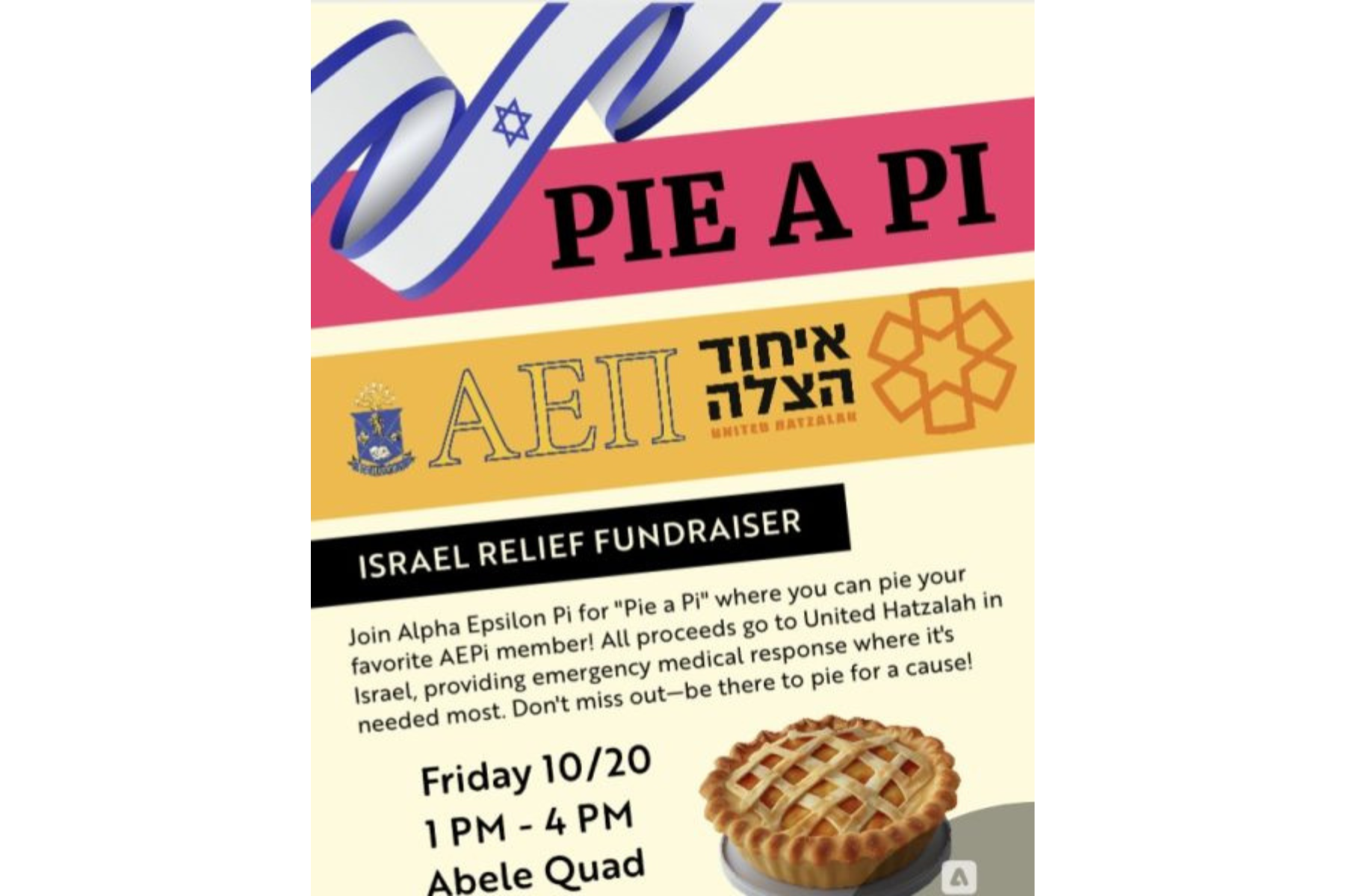Join Alpha Epsilon Pi for “Pie a Pi” where you can pie your favorite AEPi member! All proceeds go to United Hatzalah in Israel, providing emergency medical response where it’s needed most. Don’t miss out-be there to pie for a cause! Come for a chance to pie Rabbi Nossen himself!
