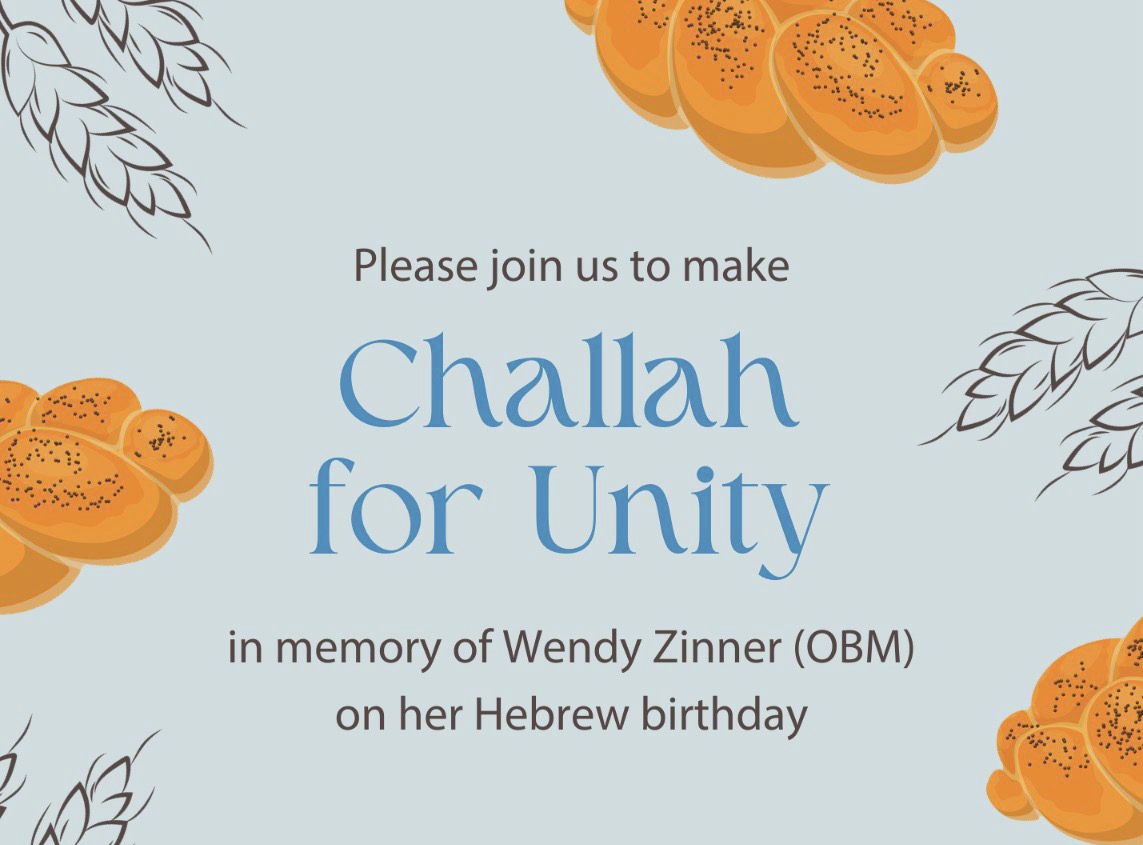 Please join me on Thursday night for an evening of charity and unity through making challah and honoring the memory of my Mother, Wendy Zinner (Z”L).