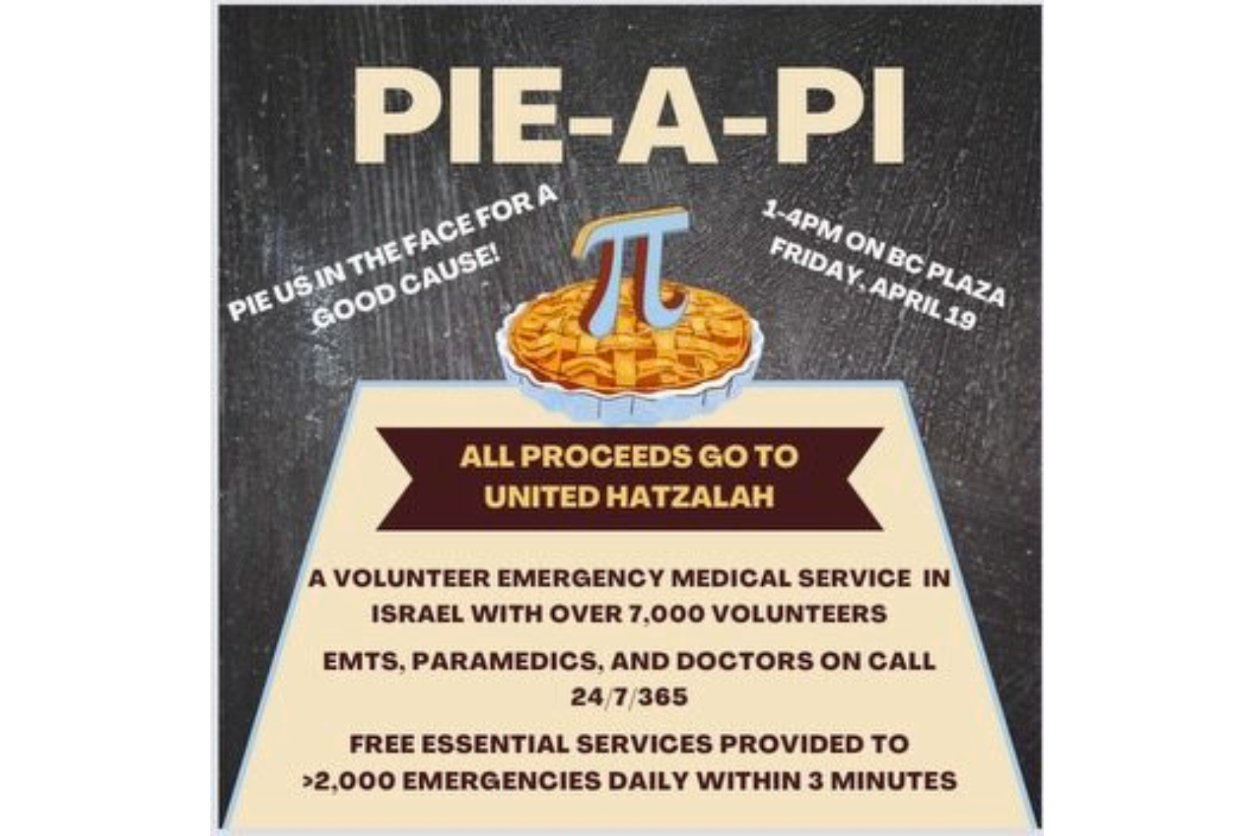 Join Alpha Epsilon Pi (Delta Kappa Chapter) on BC Plaza where you can pie your favorite AEPi brother! All proceeds go toward United Hatzalah in Israel, providing emergency medical response where it’s needed most. Don’t miss out – be there to pie for a cause!